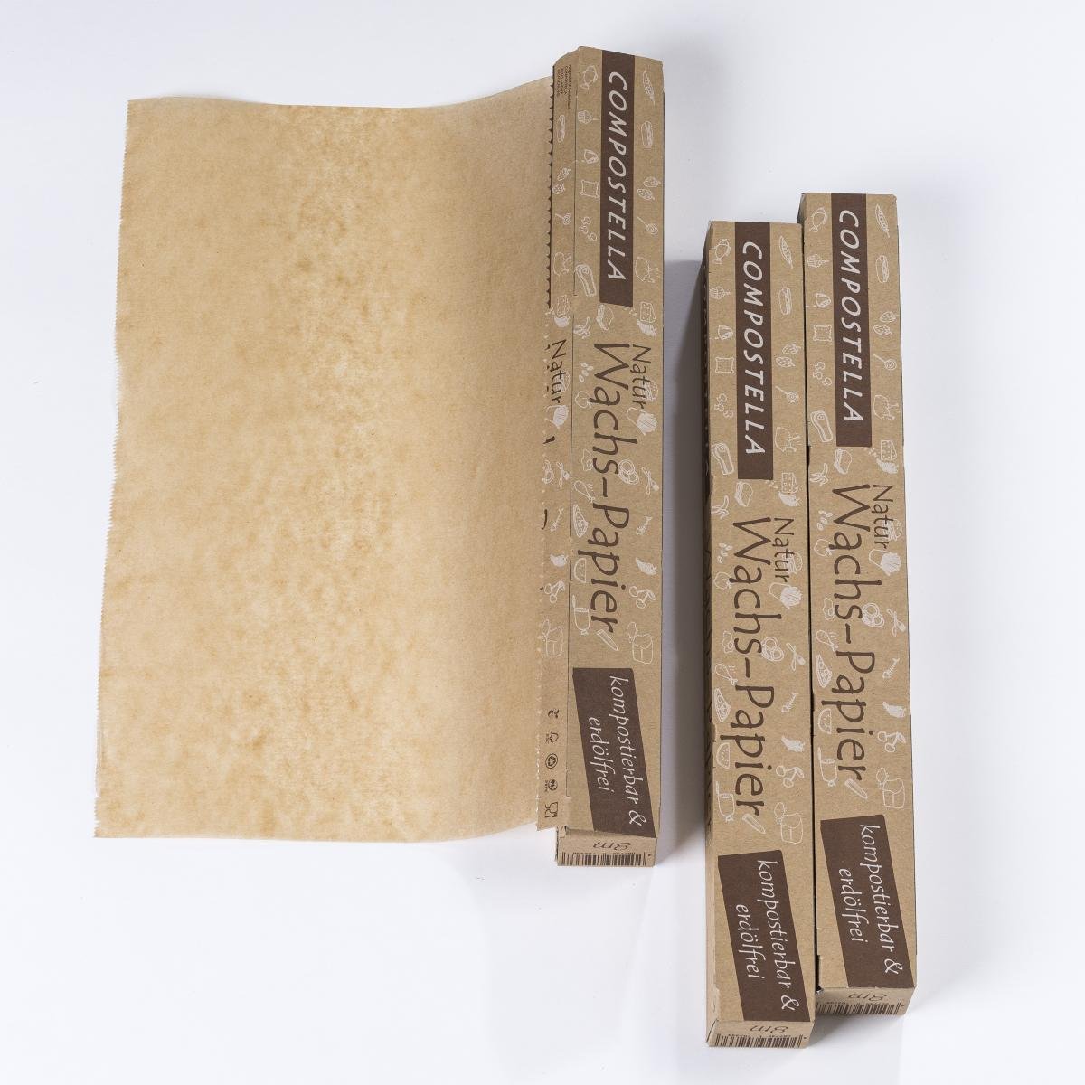 Jetzt gibt es eine ökologisch sinnvolle Alternative für die Verpackung von Lebensmitteln: Compostella Naturwachs-Papier. Es handelt sich um ein naturbraunes, ungebleichtes Zellulosepapier, das auf beiden Seiten hauchdünn mit pflanzlichem Carnaubawachs beschichtet ist. Herkömmliches Wachspapier ist mit erdölbasiertem Wachs wie z.B. mit Paraffin beschichtet, Carnaubawachs hingegen wird aus den Blättern der in Südamerika beheimateten Carnaubapalme gewonnen.
