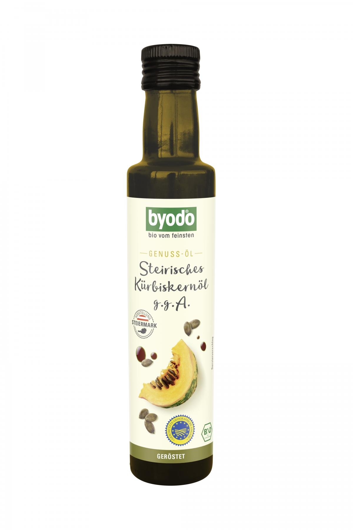 Für das kräftig-nussige steirische Kürbiskernöl g.g.A. von Byodo werden feine Bio-Kürbiskerne nach alter Handwerkskunst sorgsam geröstet. So entwickeln sie ihr intensives Aroma und geben dem wertvollen Öl aus erster Pressung, das reich an ungesättigten Fettsäuren ist, den wunderbar kräftigen Geschmack. Das köstliche Kürbiskernöl verfeinert wunderbar herzhafte Salate und Suppen, gibt aber auch Süßspeisen eine herrlich nussige Note.