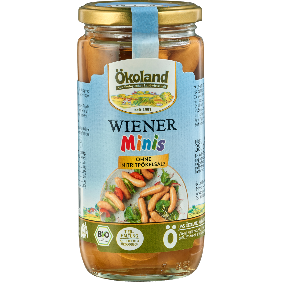 Ökoland Wiener Minis sind aus hochwertigem Bio-Schweinefleisch und geschmackvollen Bio-Gewürzen hergestellt und eignen sich besonders als Einlage in Gemüse-Eintöpfen oder als Partywürstchen für Spieße und kleine Snacks. Der natürliche Buchenholzrauch gibt den Würstchen eine herzhafte Note. Hochwertiges Bio-Fleisch bedeutet, dass unsere Bio-Bauern konsequent für eine artgerechte Haltung und gesunde Fütterung der Tiere sorgen.Die Verarbeitung des hochwertigen Bio-Fleisches und der geschmackvollen Bio-Gewürze erfolgt nach strengen Qualitätsrichtlinien.