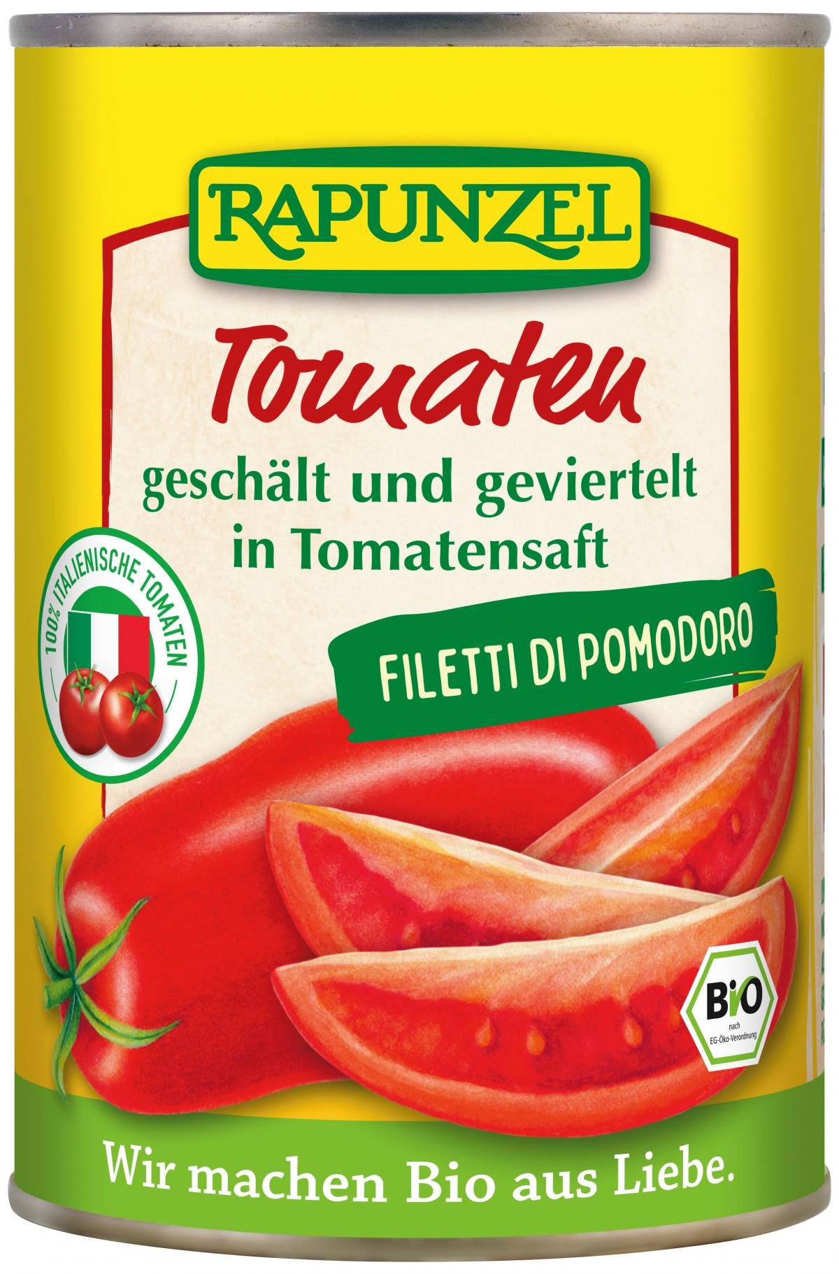 Sonnengereifte, geschälte und geviertelte italienische Tomaten in feinem Tomatensaft eingelegt. Ihr Geschmack ist besonders fruchtig und aromatisch. In Italien sind die feinen Tomatenfilets bekannt als Filetti di Pomodoro und eine beliebte Spezialität. Die mundgerechten Tomatenstücke sind gebrauchsfertig und müssen nur kurz erwärmt werden.