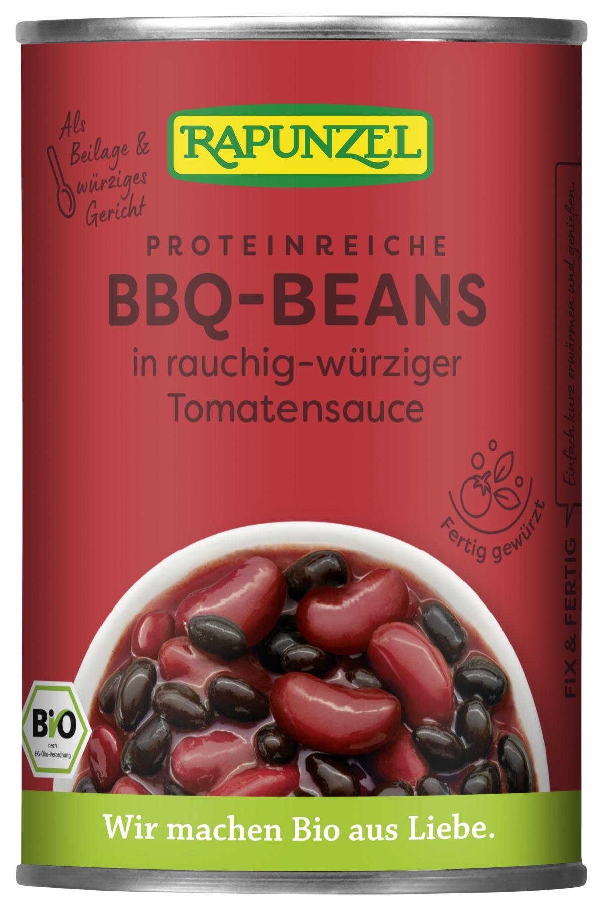 Der Bohnen-Mix im BBQ-Style! Eine köstliche Kombination aus aromatischen schwarzen Bohnen und milden Kidney Bohnen in einer typisch rauchig-würzigen Barbecue-Sauce. Dieser schmackhafte und proteinreiche Mix ist vielseitig verwendbar und bereits gewürzt. Für den BBQ-Taste im Handumdrehen - fix & fertig, für die schnelle Bio-Küche. Einfach kurz erwärmen und genießen.