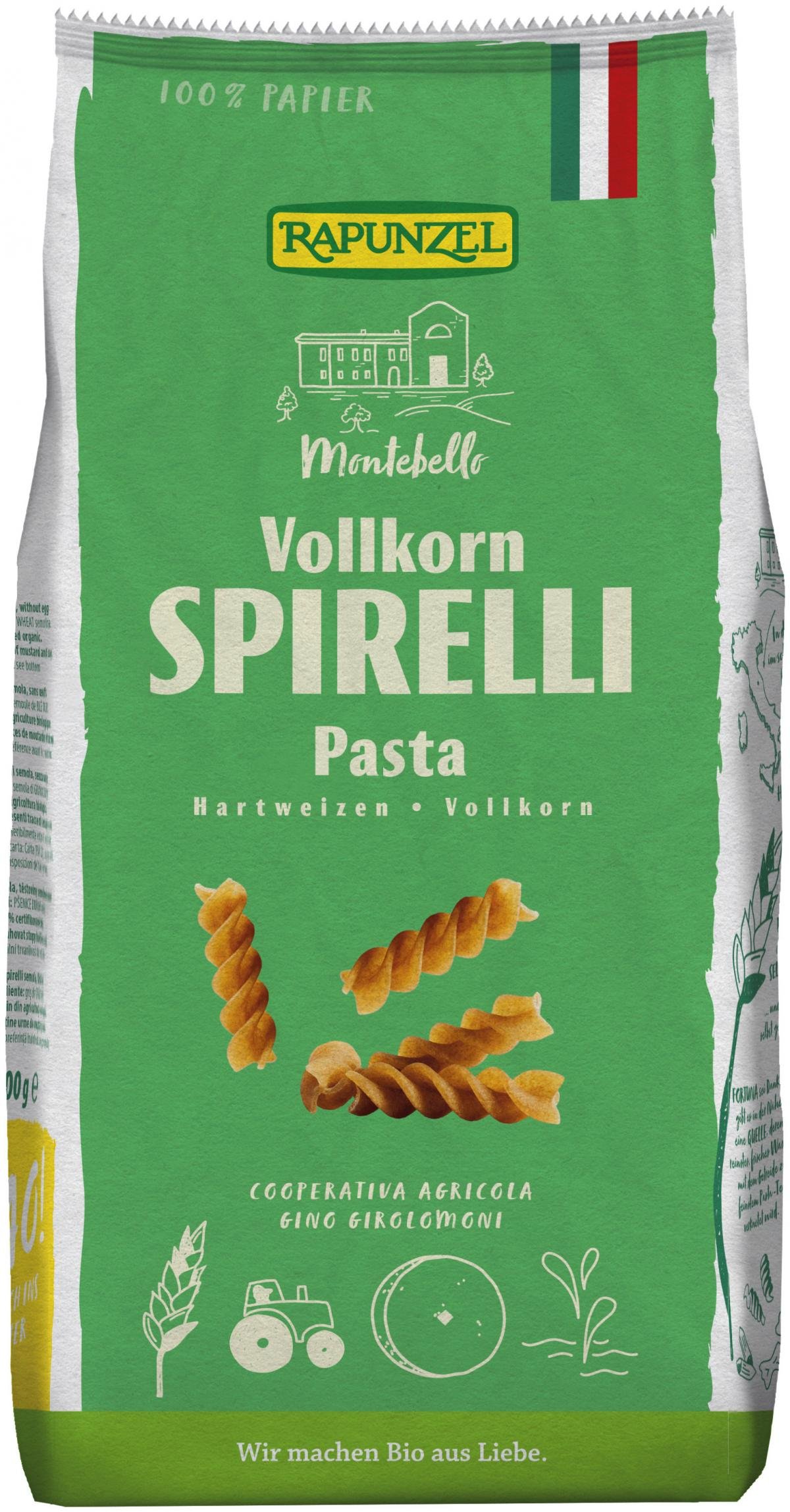 Spirelli - Eine der beliebtesten Sorten der Pasta-Welt. Unser italienischer Pastificio stellt die Rapunzel Pasta nach alter Tradition nur aus bestem italienischem Hartweizenvollkorngrieß und reinem Quellwasser her. Eine langsame und schonende Trocknung bei niedrigen Temperaturen sorgt für den typischen Geschmack und beim Kochen für den richtigen Biss.