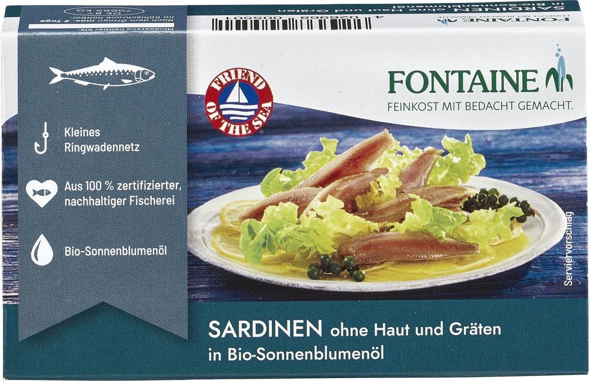 Die Schwarmfische werden auf kleinen Booten per Echolot geortet und dann mit großmaschigen Ringwadennetzen gefangen. So werden die Sardinen weniger gedrückt oder gequetscht; Jungfische können wieder nach draußen gelangen. Diese Vollkonserve enthält neben den Sardinen ausschließlich Meersalz und kaltgepresstes Bio-Sonnenblumenöl.