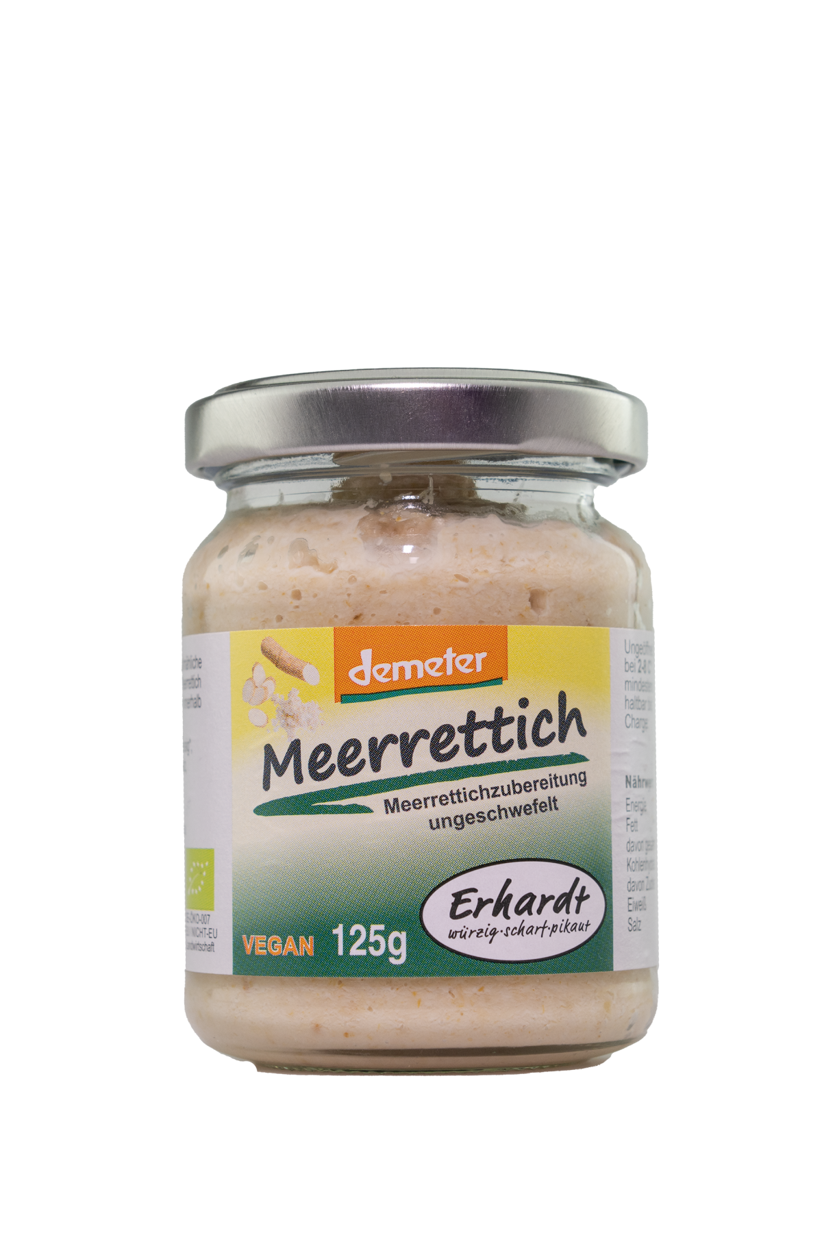 Meerrettich** (53%,) Wasser, Apfelessig**, Sonnenblumenöl**, Apfeldicksaft*, Meersalz, Verdickungsmittel: Guarkernmehl*