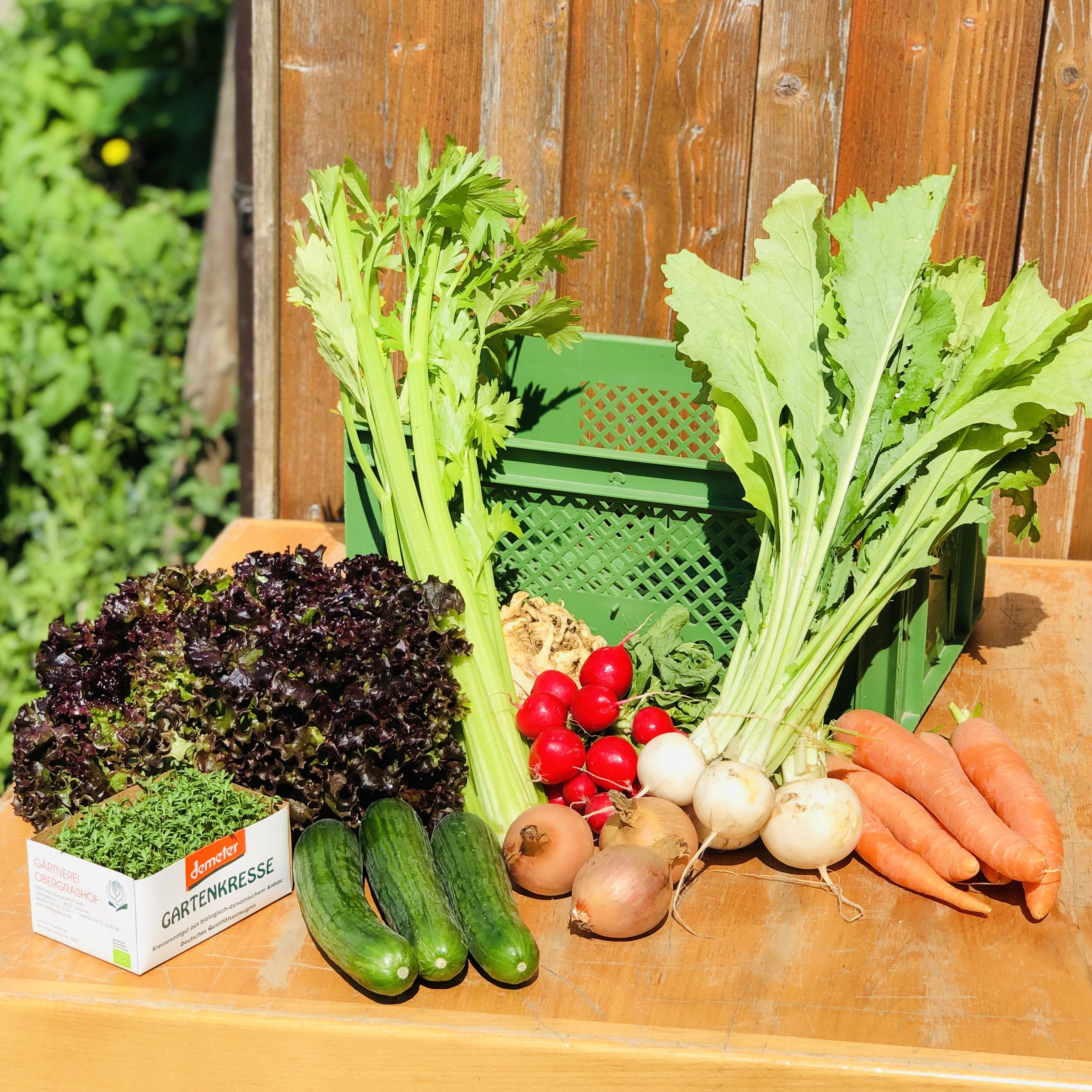 In unsere kleine Regionalkiste packen wir Gemüse und Salate der Saison aus Franken, Bayern und Deutschland.